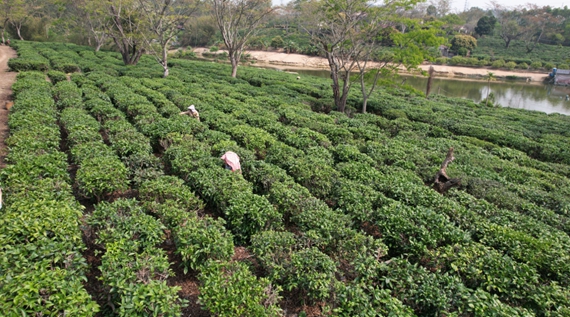 眼下正值春茶采摘的黄金时节,在新会区双水镇金鸡茶场里,漫山遍野的茶树吐露新芽,一片生机勃勃的景象。